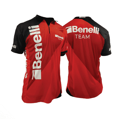 Benelli lyhythihainen ampujan paita. Edessä ja takana Benelli Team painatus. Edessä 1/2 vetoketju ja matala pystykaulus. Hyvin laskeutuvaa, miellyttävän tuntuista, viileää kangasta. -